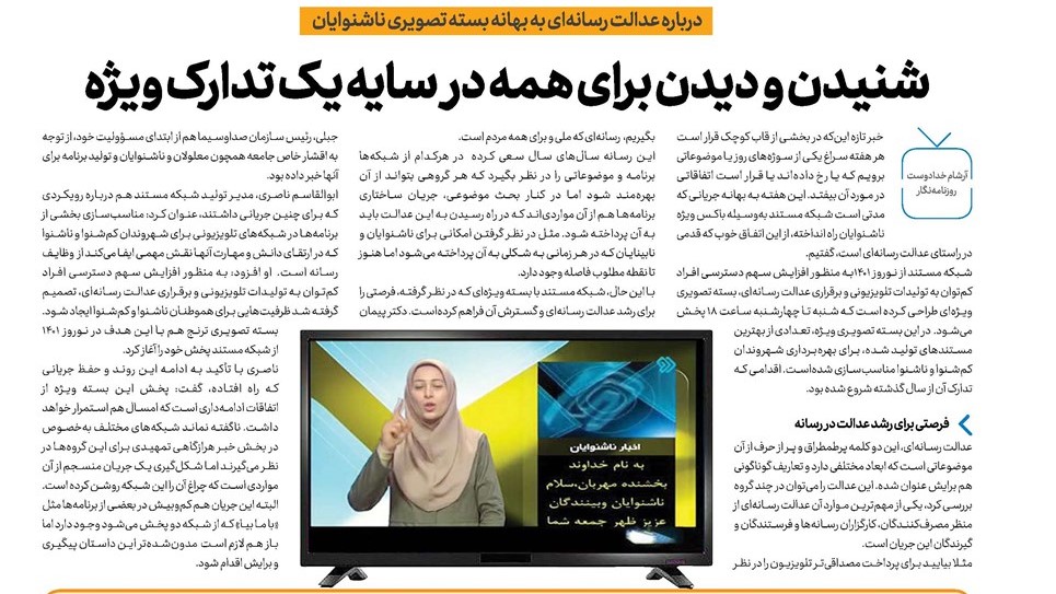 شبکه مستند از نوروز ۱۴۰۱به منظور افزایش سهم دسترسی افراد کمتوان به تولیدات تلویزیونی و برقراری عدالت رسانهای، بسته تصویری ویژهای طراحی کرده است
