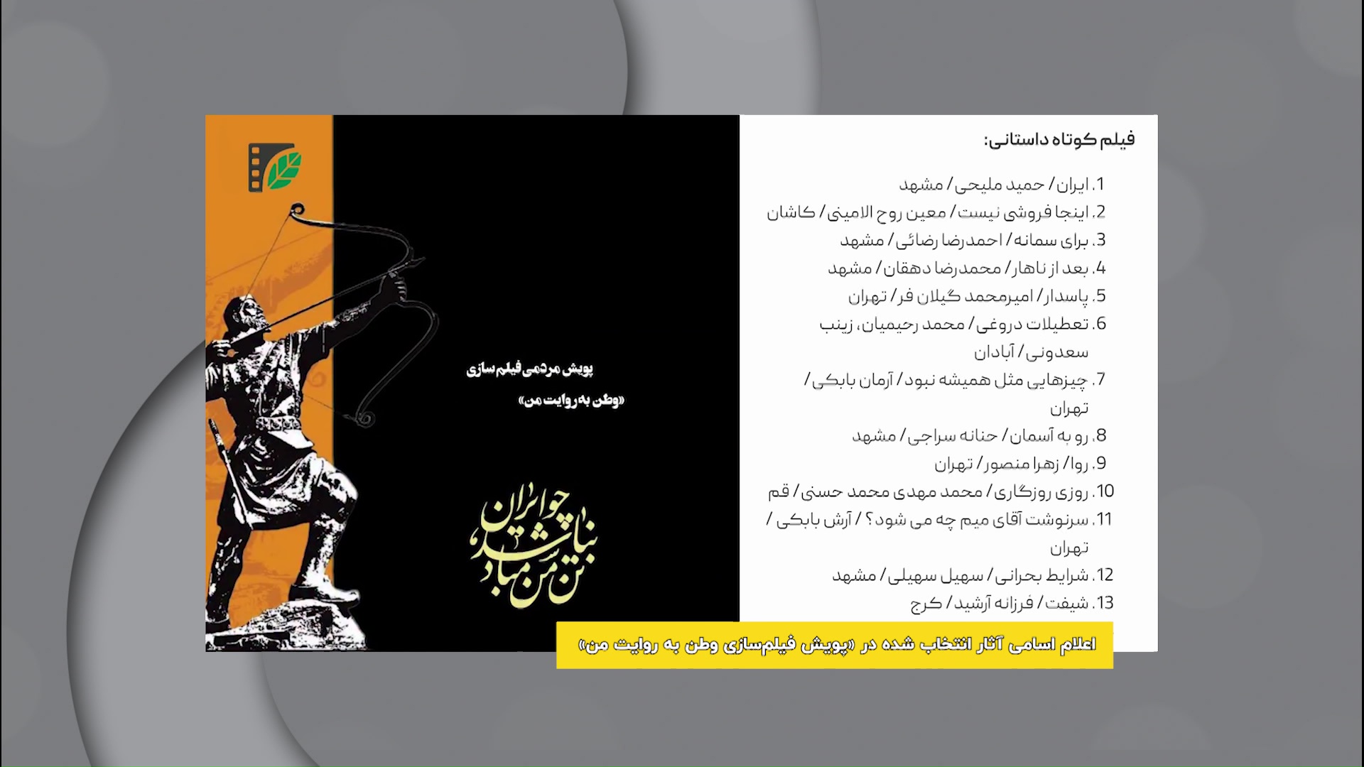 اسامی آثار انتخابشده در «پویش فیلمسازی وطن به روایت من» در چهار رشته مختلف از جمله فیلم مستند، اعلام شد.